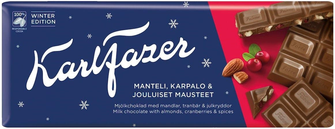 Finland’s most-loved chocolate since 1922. Its unique, smooth taste is guaranteed by using only the very best ingredients. Soft milk chocolate, roasted almond and dried cranberry combine with a generous pinch of Christmas spices in this wintery, seasonal flavor.
