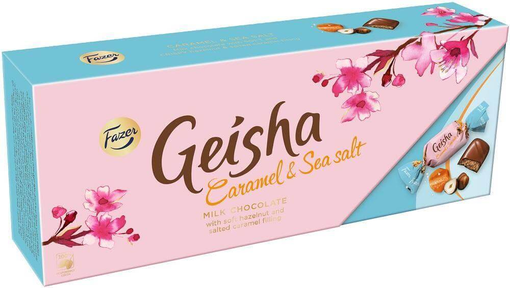 Geisha Caramel & Sea Salt - milk chocolate wrapped around hazelnut nougat filling with salted caramel crunch. A soft yet crispy filling is waiting beneath the milk chocolate coating of the delicious Geisha Caramel & Sea Salt pralines.