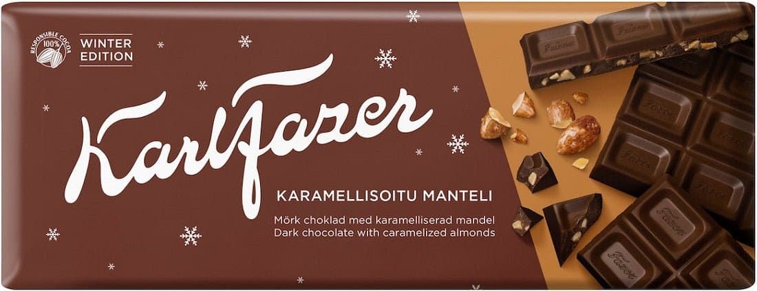 Karl Fazer Caramelized Almond - this delicious bar is combination of two rich tastes. The smooth caramelized almond complements the soft dark chocolate.